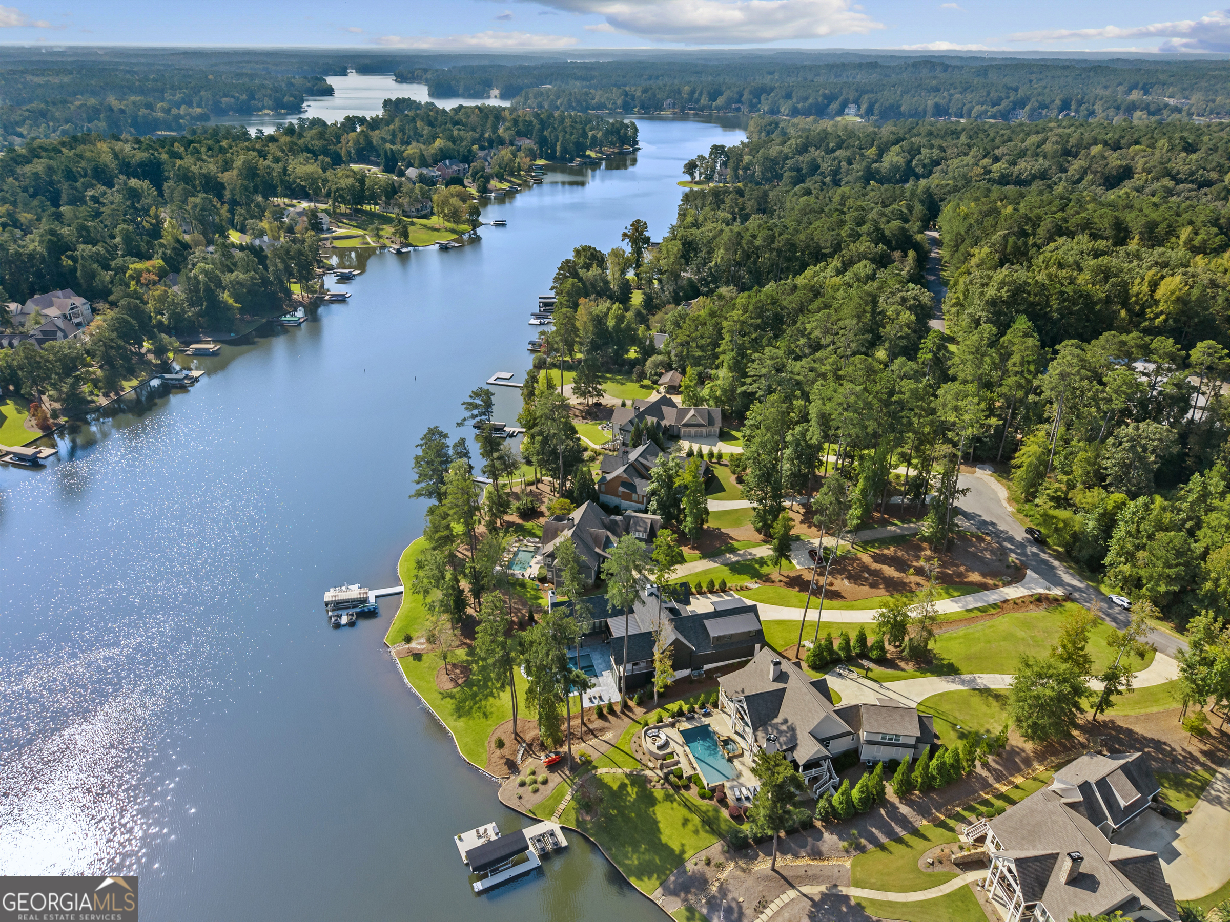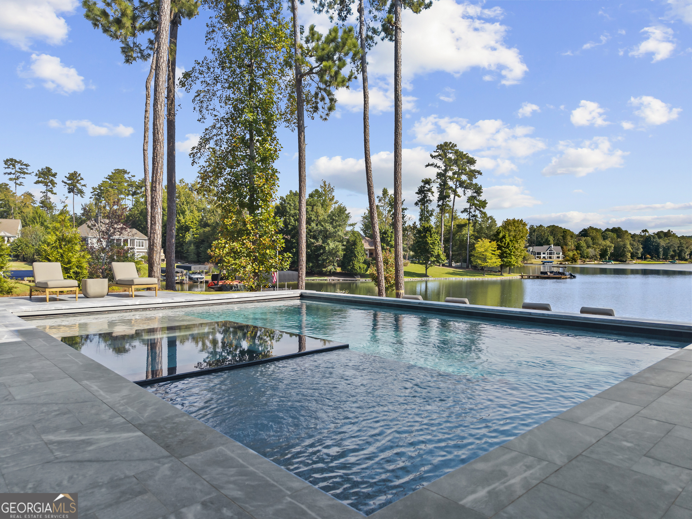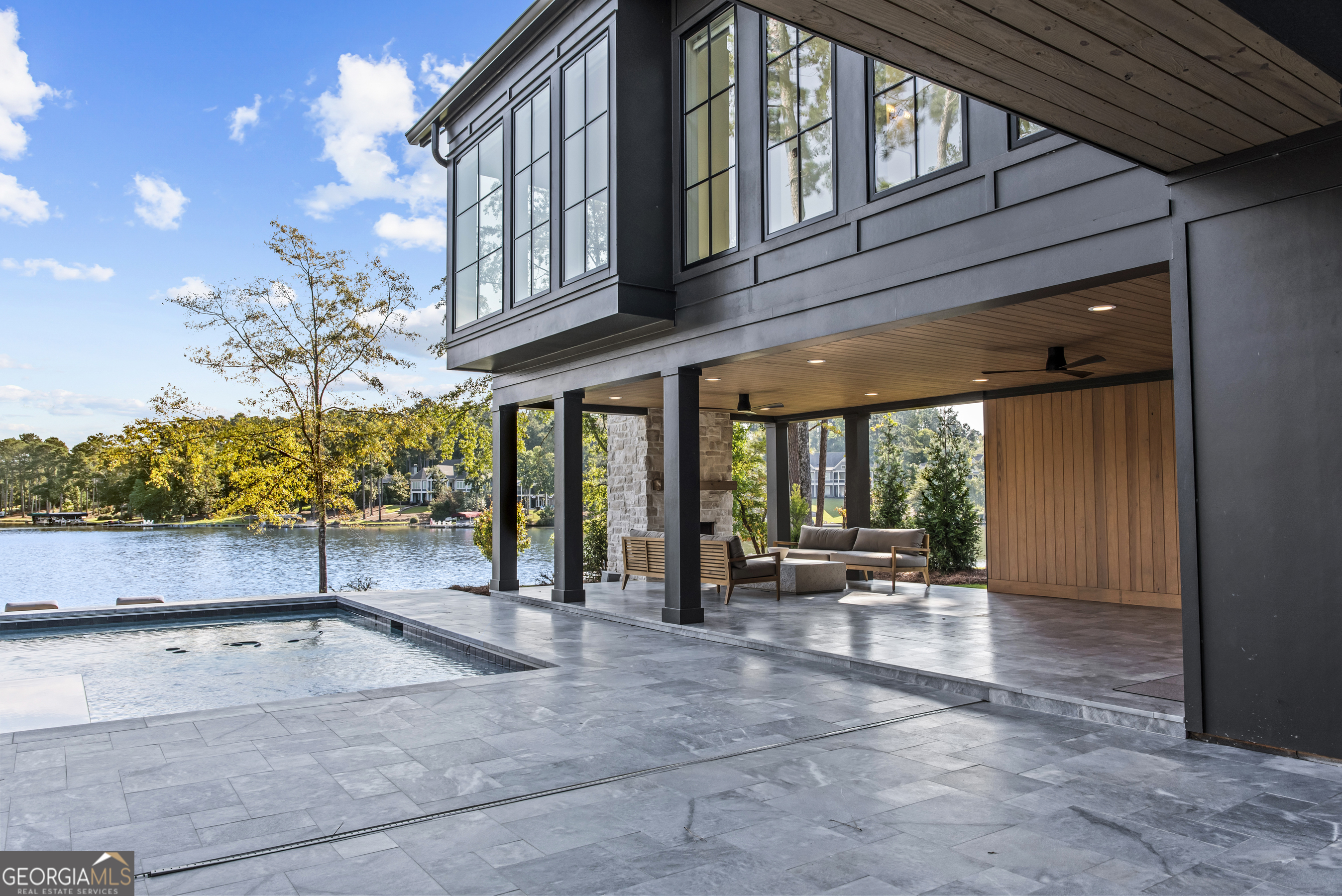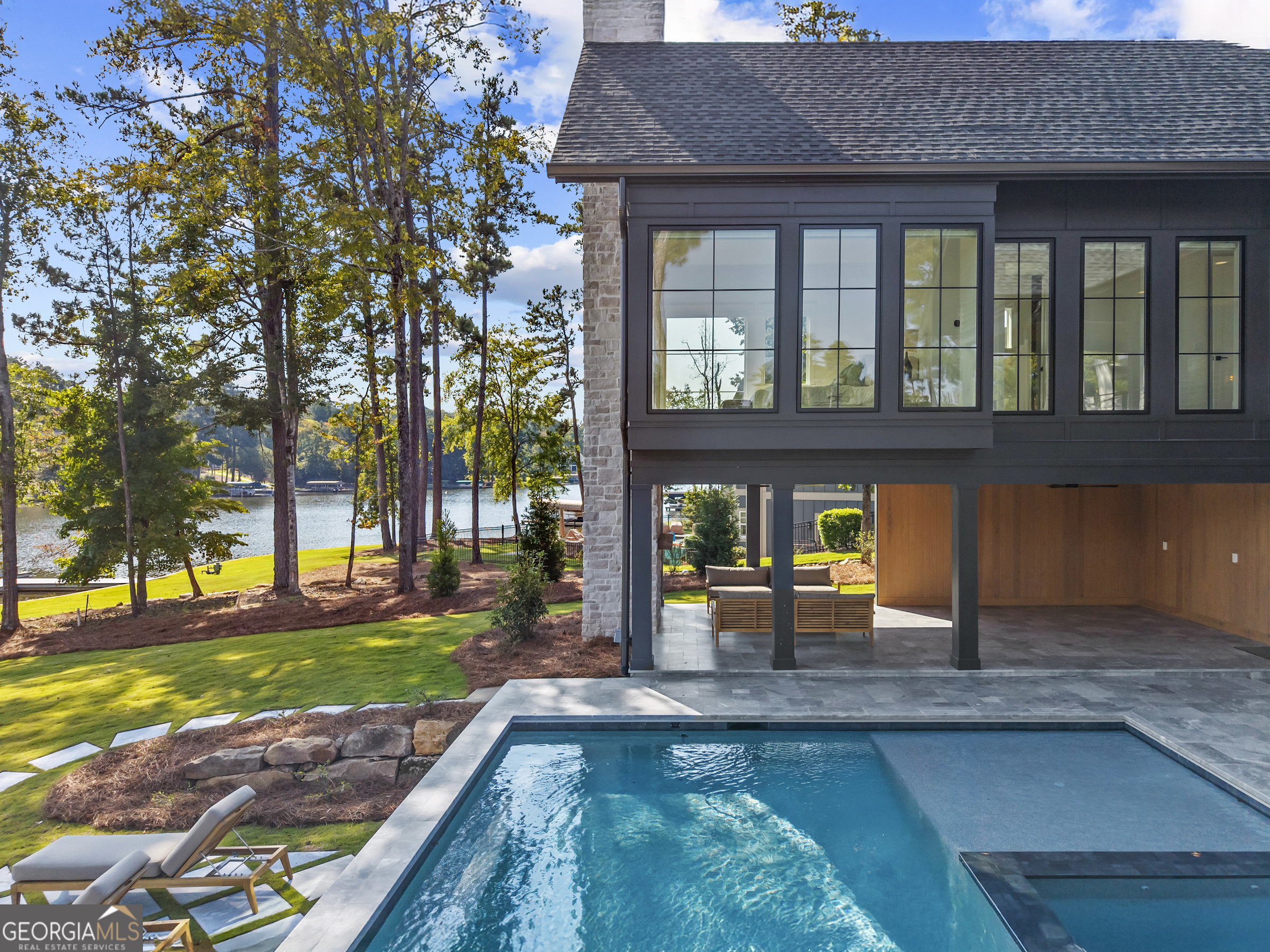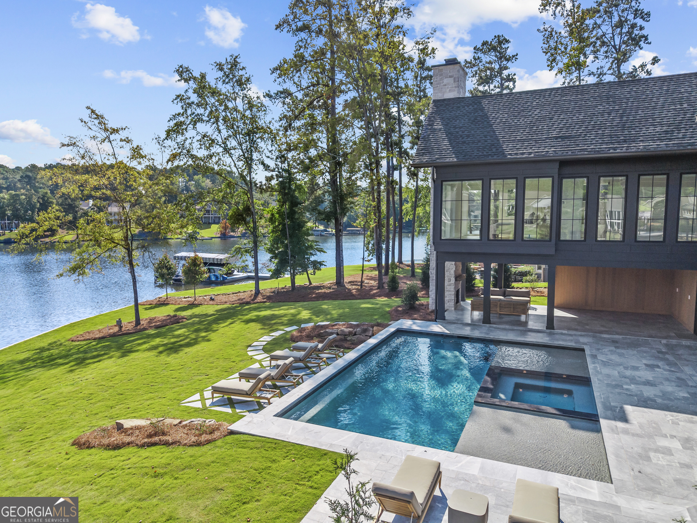 MODERN CALIFORNIA-INSPIRED LAKEFRONT RETREAT WITH POOL | Built 2025. A true one-of-a-kind masterpiece, this lakefront home showcases breathtaking water views from its lush, level lawn, overlooking an oversized heated saltwater pool with tanning ledge and spa. Designed with exceptional attention to detail, the home seamlessly blends architectural sophistication with effortless indoor-outdoor living. Upon entry, soaring cathedral ceilings set the tone, drawing you into expansive living spaces framed by wall-to-wall sliding glass doors. The living room, anchored by the limestone fireplace, flows seamlessly into the dining area and chef's kitchen-each space capturing uninterrupted, panoramic lake views. The kitchen is both stunning and highly functional, featuring quartzite countertops, a Thermador refrigerator and separate freezer, a Wolf range, and a beautifully appointed butler's pantry. An elegant wet bar with beverage refrigerator enhances the home's ability to entertain with ease. The primary suite is a private sanctuary, wrapped in glass and designed to capture breathtaking sunrise views over the water. The spa-inspired bath features a deep soaking tub, separate shower, and generous custom closets. Upstairs, two additional bedroom suites provide comfort and privacy, while the terrace level is designed for both relaxation and recreation. This level includes a spacious family room with wet bar, a flexible space ideal for a gym or golf simulator, and three additional guest suites. Located in Harbor Club, this home represents the pinnacle of modern lakefront living-offering refined design, exceptional amenities, and a rare connection to the water. The seller is including a luxury membership to one of Lake Oconee's most prestigious hotels, providing access to award-winning spa, dining, and amenities. Max Dock being installed early Spring. Only a five-minute boat ride to Reynolds Lake Club and The Ritz-Carlton, providing effortless access to some of the lake's most sought-after destinations.